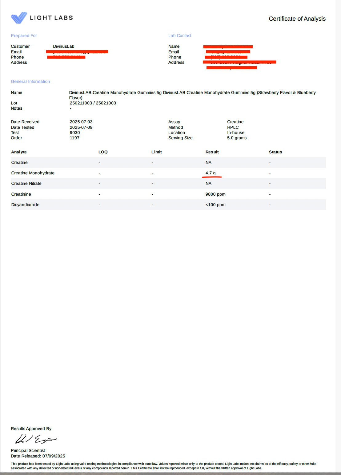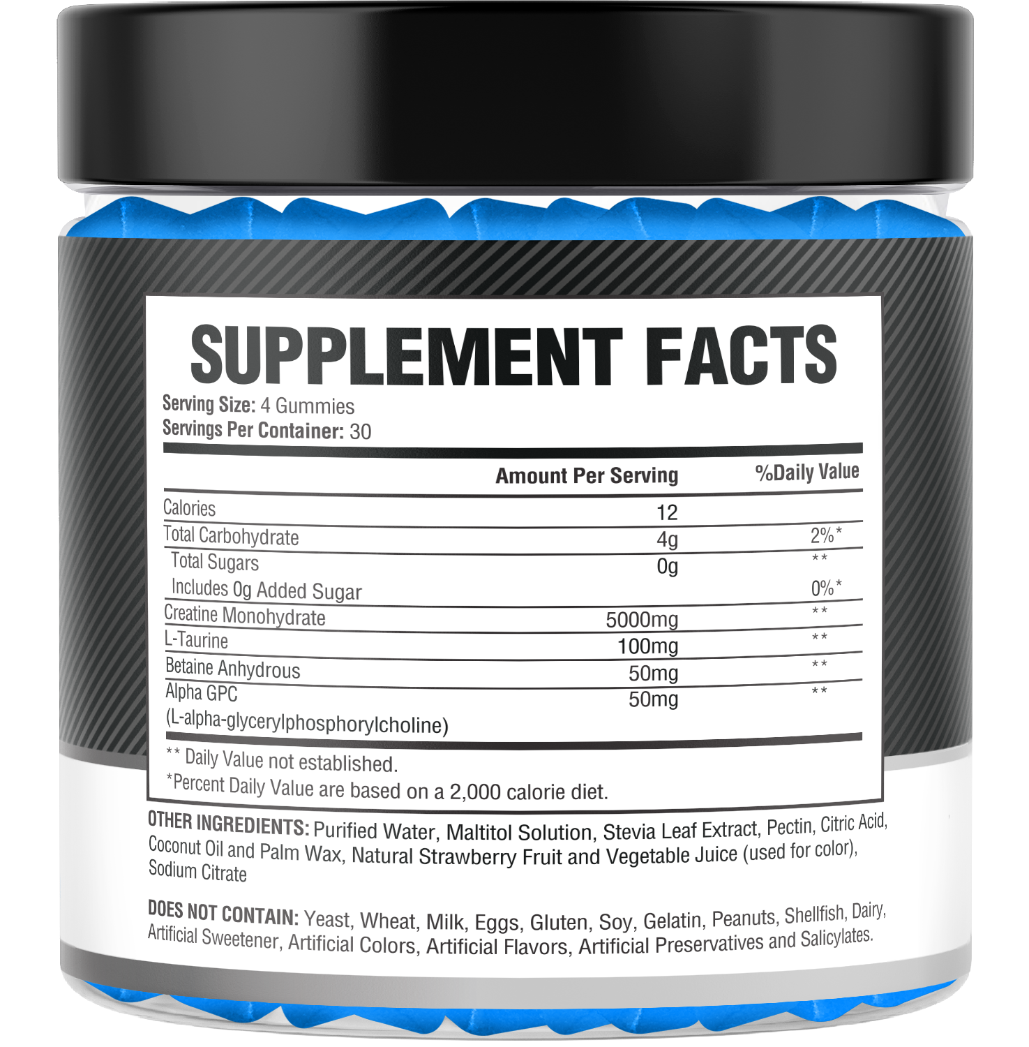 - Serving Size: 4 gummies (5g of Creatine Monohydrate)